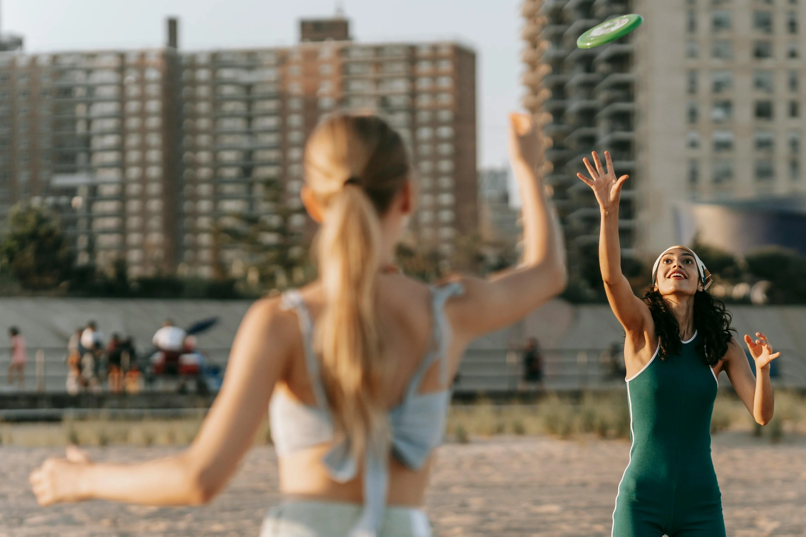 In beach frisbee, the objective is to pass the frisbee to your teammates until you reach your opponent’s end zone and score a point, similar to American football.