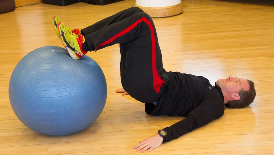 4. Stability ball leg curls: Lie on your back with a stability ball under your heels and your legs straight. Carefully lift your hips off the ground, stabilizing your body in a straight plank. Bend your knees, and slowly roll the ball toward your body until your upper and lower legs are at 90 degrees. Pause, then roll the ball back to starting position. Repeat 10 to 15 times.