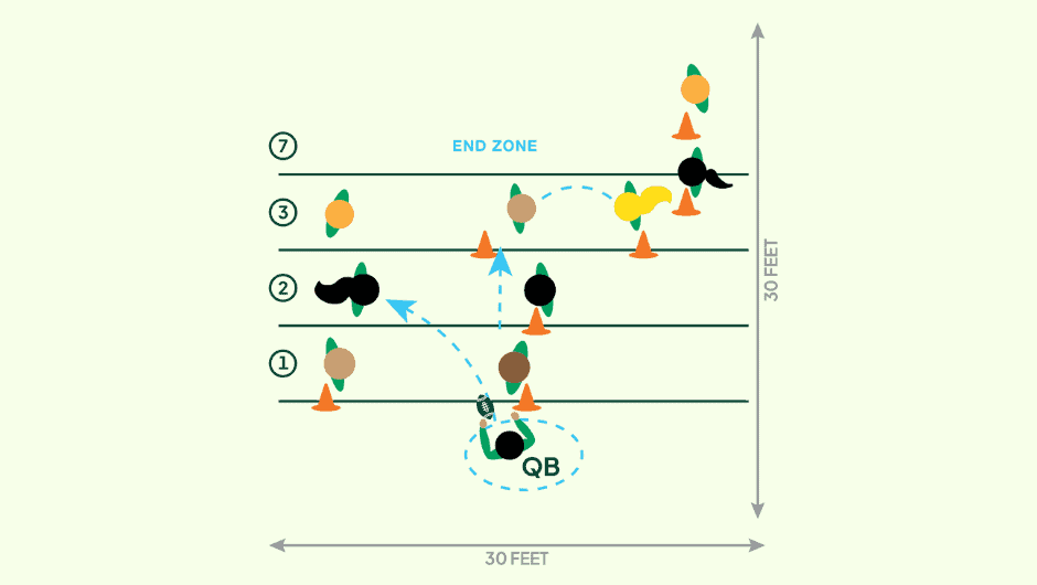 3. After every 4 passes (4 downs/4 pass attempts), the teams switch from offense to defense. On the field, all players must stay within their zones. The defending team will cover the offensive team’s players to limit their scoring. No tackling or pushing!